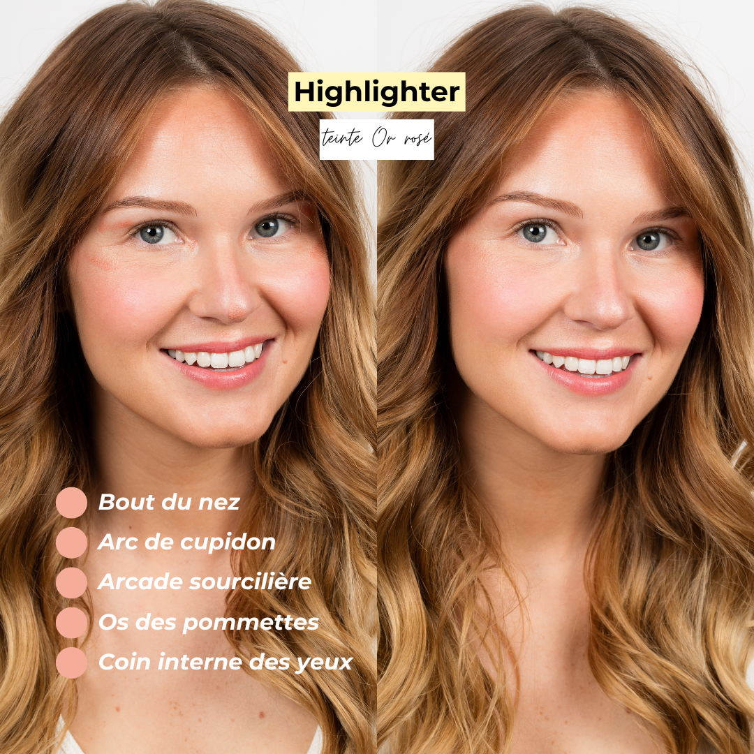 ✨ L’Highlighter vient mettre en valeur les zones où la lumière accroche : sur l’arc de cupidon (au-dessus des lèvres), dans le creux inférieur de l’arcade sourcilière, dans le coin interne des yeux, sur le bout du nez et sur l’os des pommettes.